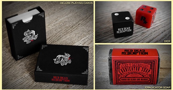 Acaba de chegar a loja da Rockstar um pacote de colecionador completo que inclui baralho, dados e doces em formato de dinamite, tudo devidamente personalizado com temas do jogo e da empresa. E para os mais convencionais, a loja também disponibiliza camisetas e, é claro, o jogo.